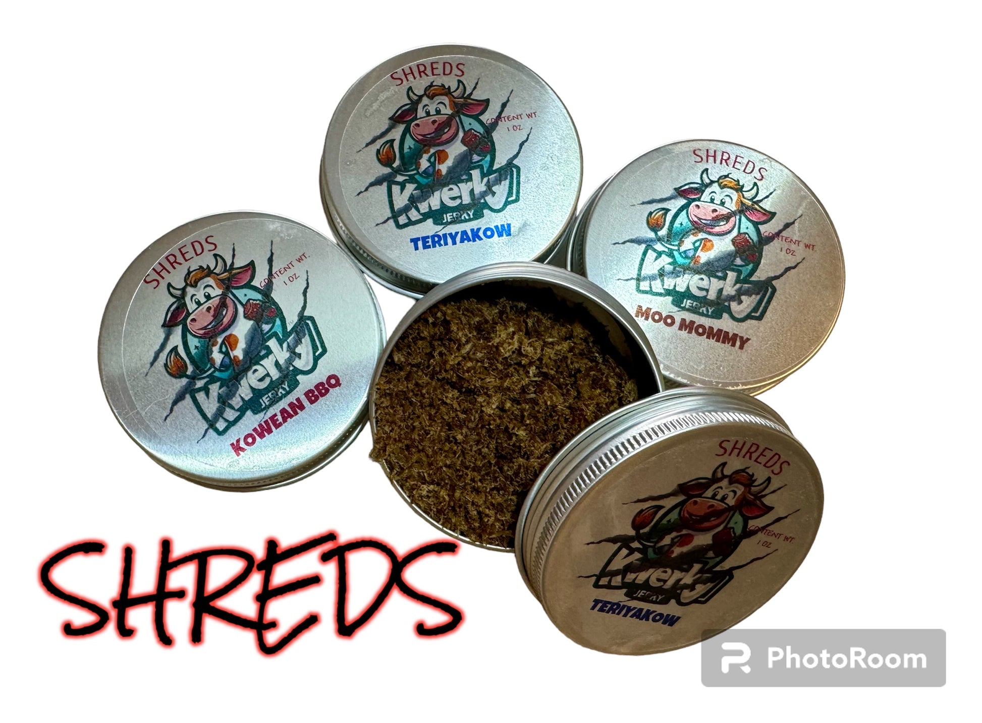 Teriyakow, Moo Mommy and Kowean BBQ in an ON THE GO, pocket sized tin. Shredded, intense flavors to savor, enjoy KWERKY JERKY wherever you enjoy life. Just a pinch in your cheek for lasting flavor.